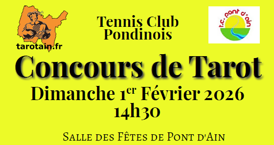 Tournoi complet Lieu: Salle des Fêtes, 01160 Pont d'AinHoraire de la première séance : Samedi 31/01 à 08h45Repas : Menu ...